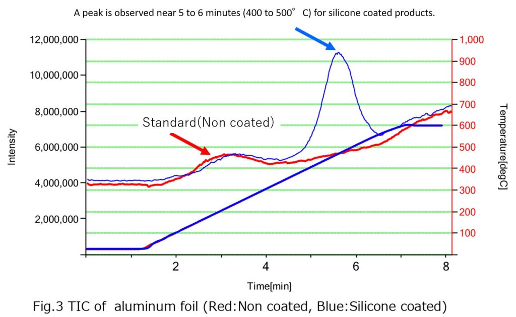 | Measurement Method | Approximately 5 mg of aluminum foil was cut and introduced into the POT L. Measurements were conducted using mass spectrometer while the temperature was increased from room temperature to 600°C. (Red: standard foil; Blue: silicone-coated foil) |