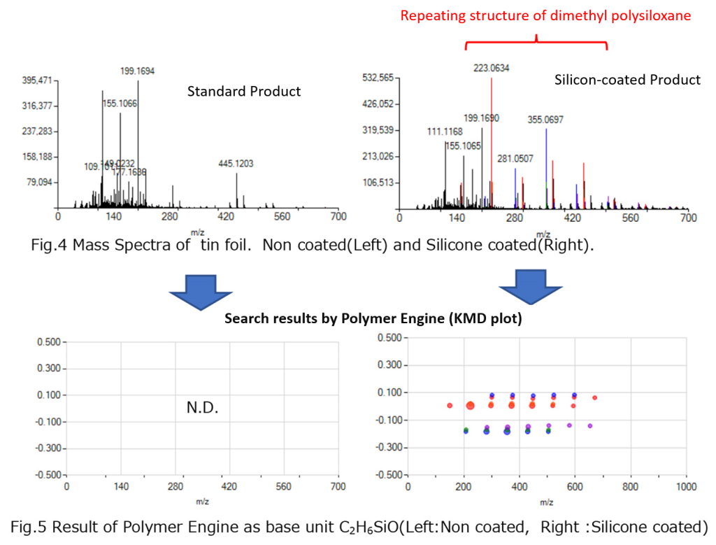 Using the temperature gradient mode of the ChemZo ion source, two types of aluminum foil (standard and silicone-coated foil) were measured with a time-of-flight mass spectrometer as the detector.