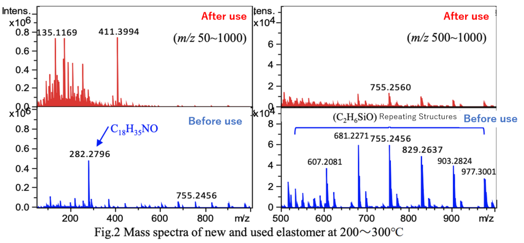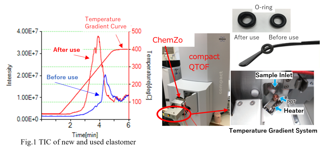 The analysis was conducted using a time-of-flight mass spectrometer equipped with the ChemZo ion source and a temperature gradient device to examine the temporal changes in thermoplastic elastomers (O-rings) before and after use.