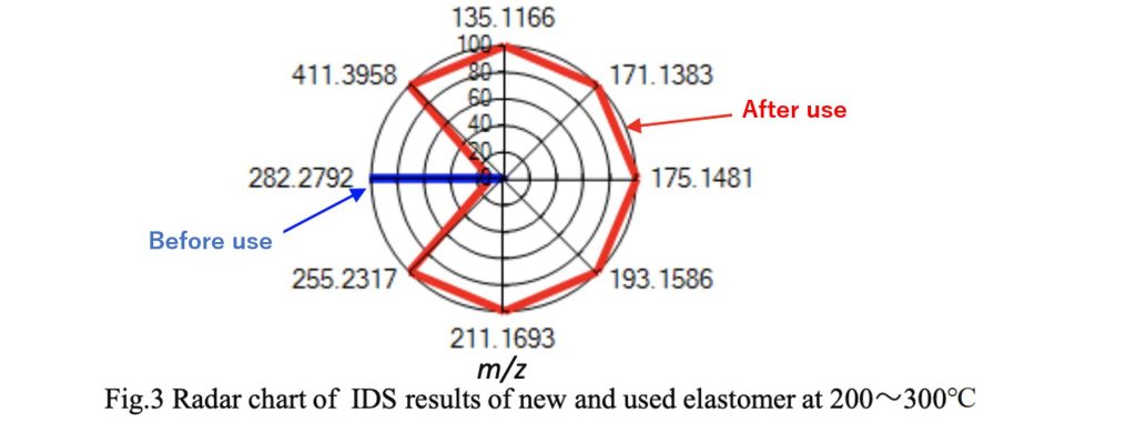 Fig. 3 displays the results of the differential analysis (IDS) before and after use in a radar chart. A large number of low molecular weight thermal desorption components were detected from the elastomer after use, likely due to the degradation of the resin in the rigid portion of the elastomer after long-term use.