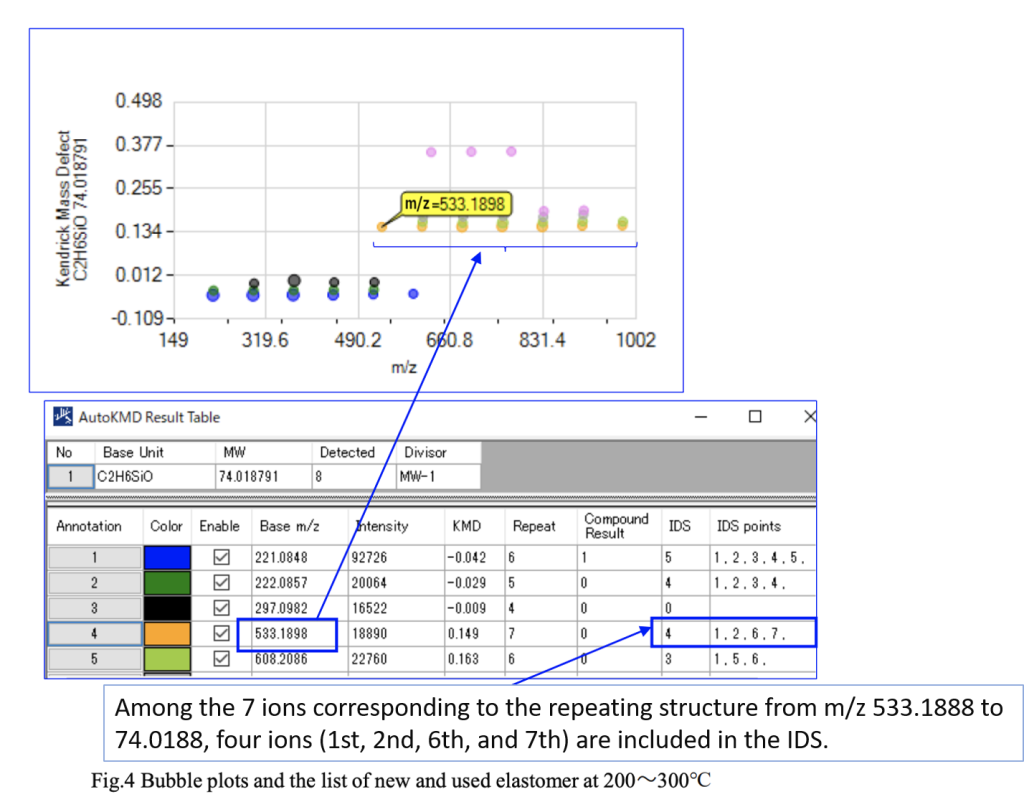 To compare the resin samples before and after use, the TIC region from 200 to 300°C was examined using Polymer Engine. Fig. 4 shows the bubble plot and summary table generated by Polymer Engine. Polymer Engine is an analysis software designed to extract repeating structures of polymers from mass spectra. In this case, the repeated ions of thermally desorbed C₂H₆SiO (m/z 74.0188) are displayed. The graph features the m/z values on the X-axis and the Kendrick Mass Defect (KMD) on the Y-axis. For instance, m/z 533.1898 in Fig. 3 indicates that seven repeating units were identified starting from m/z 533.1898. In the summary table, “IDS” and “IDS Points” denote the m/z values extracted by Polymer Engine that matched with the IDS results. The table also indicates the number of such matches and the sequence position where each value was found.
