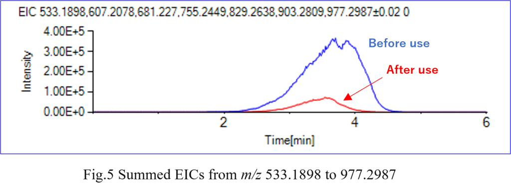 Furthermore, by combining the m/z values into an EIC (Fig. 5), it becomes possible to compare molecular species with identical repeating structures across different resins. This enables an easy comparison of differences, including degradation levels.