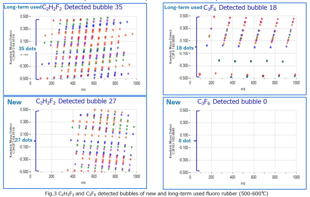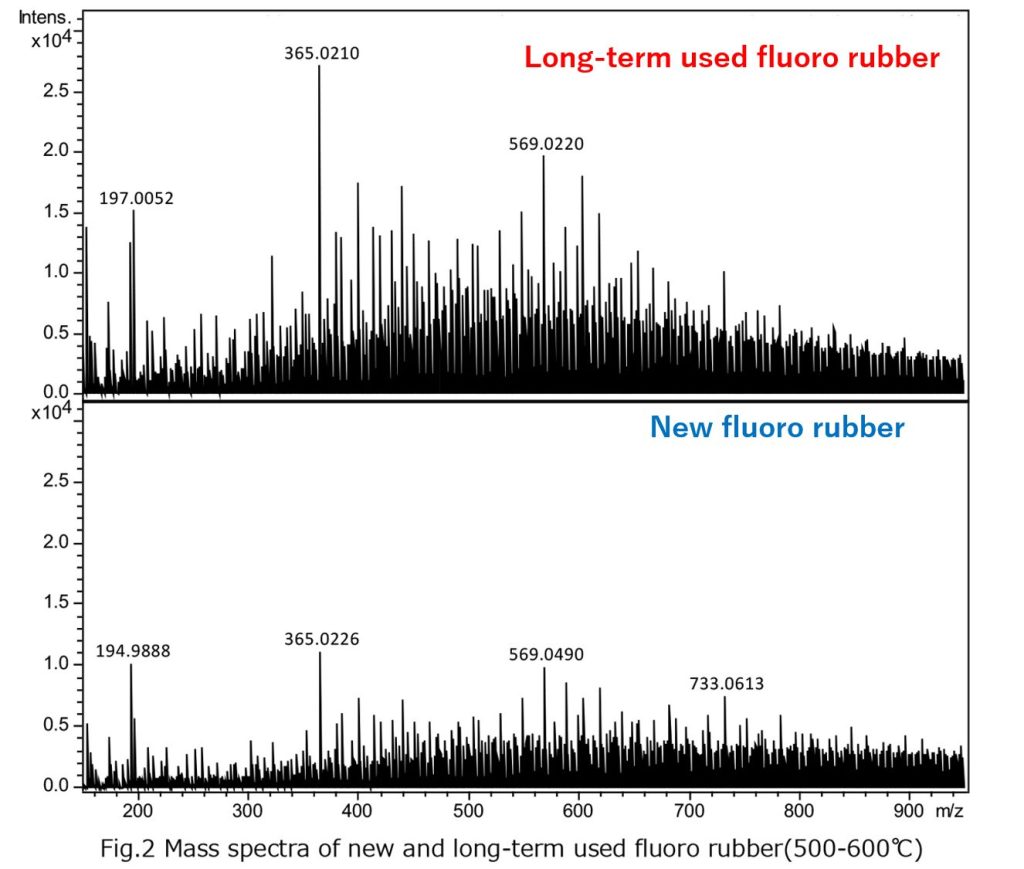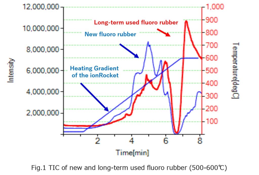 | Measurement Method | Small pieces of new and long-term used fluoro rubber with different usage histories were heated from room temperature to 600°C using a temperature gradient device while measuring mass spectrometer (negative mode). |