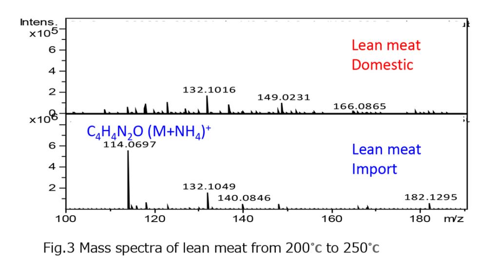Fig. 6 shows the mass spectra from 100°C to 200°C. It was confirmed that C10H20O2 was present in higher amounts in the fat compared to the lean meat.