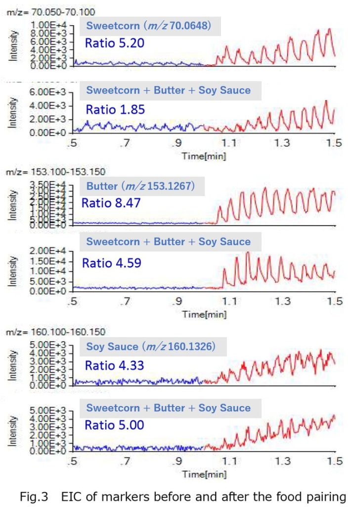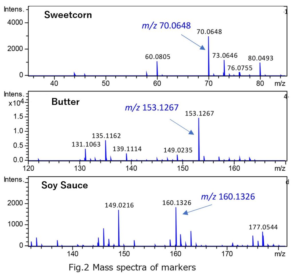Fig. 1 shows the changes in marker components of sweetcorn, butter, and soy sauce using EIC. The ratio is the comparison with the background, where a higher value indicates a marker with a larger change.