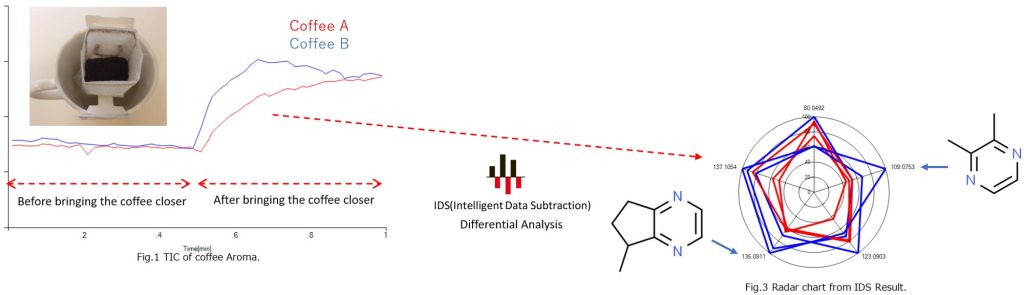 Using Spectra Scope, differences were examined after measuring the aroma components of two types of drip coffee bags with ChemZo.