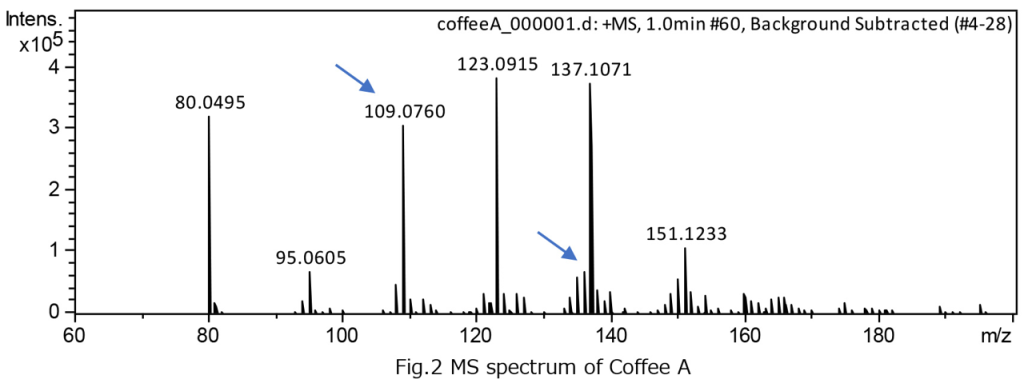 Fig. 1 shows the TIC during the measurement. The first 30 seconds were used to measure the atmospheric background, followed by 30 seconds of measurement with the coffee sample held in front of the ion source. For reproducibility verification, coffee A and B were measured three times, and differential analysis was performed using IDS. The results showed a tendency for m/z = 109.0753 and m/z = 135.0911 to be more strongly detected in coffee B (Fig. 3). Based on the search results from the aroma compound database of Compound Search, m/z = 109.0753 was identified as dimethylpyrazine and m/z = 135.0911 as cyclopentapyrazine.