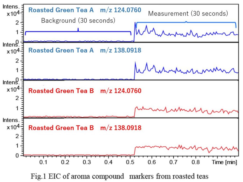 | Measurement Method | Roasted green tea, kept at room temperature (in a PET bottle), was transferred to a beaker, and the aroma was introduced to the mass spectrometer via a tube. |