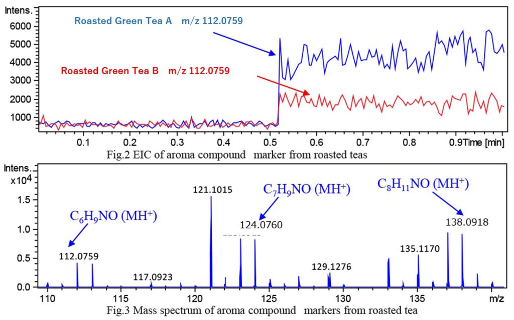 Fig. 1 shows the extracted ion chromatograms (EIC) of representative aroma components detected from two types of roasted green tea. Both were detected with high sensitivity immediately upon starting the measurement, and the same intensity was maintained even after 30 seconds. Although a slight intensity variation was observed for roasted green tea A, both teas showed similar intensities for these marker ions. On the other hand, the marker at m/z 112.0759 was detected in both teas, but the intensity from roasted green tea B was approximately half that of roasted green tea A. Even when the same aromatic components are present, such differences in intensity may characterize the taste and flavor of the beverage. Fig. 3 shows the mass spectrum of the marker and the chemical formula candidates determined from the precise mass as MH+.