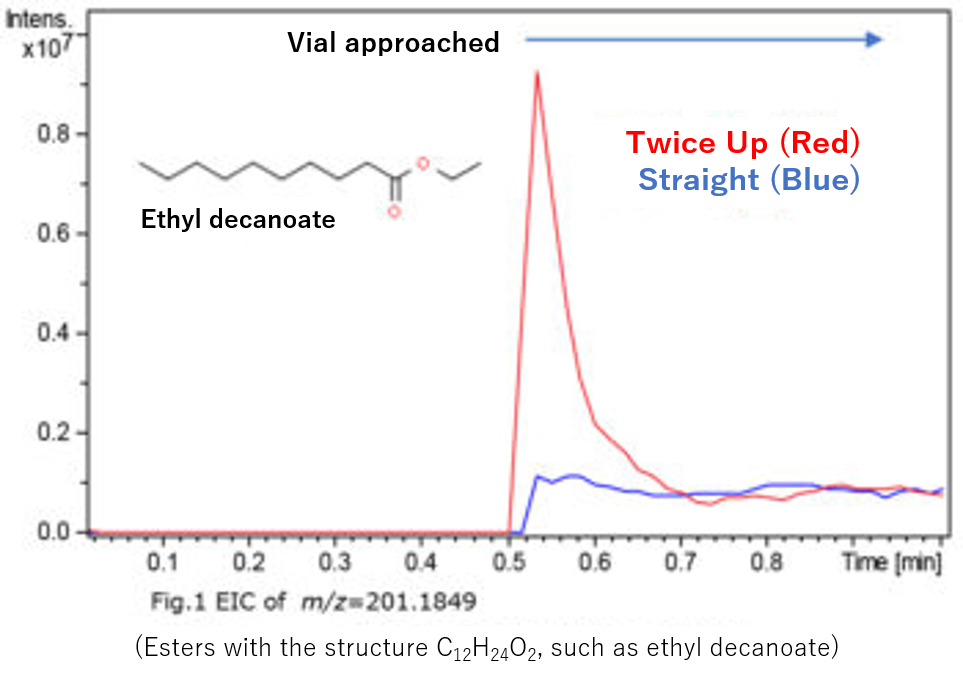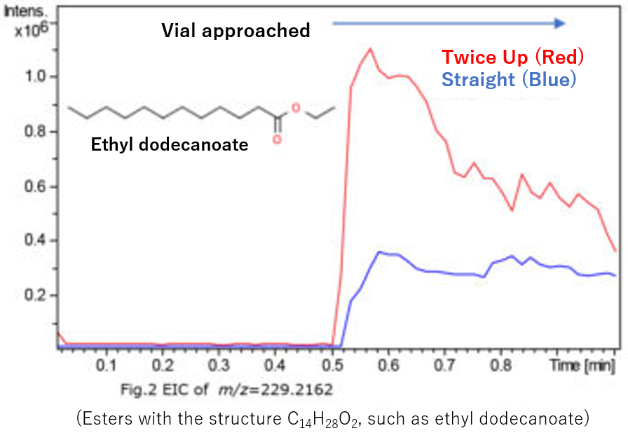| Measurement Method | Twice Up (red): 2 mL of whisky + 2 mL of water Straight (blue): 4 mL of whisky Each sample was placed in a vial, and the aromatic components were measured directly. ![]() |