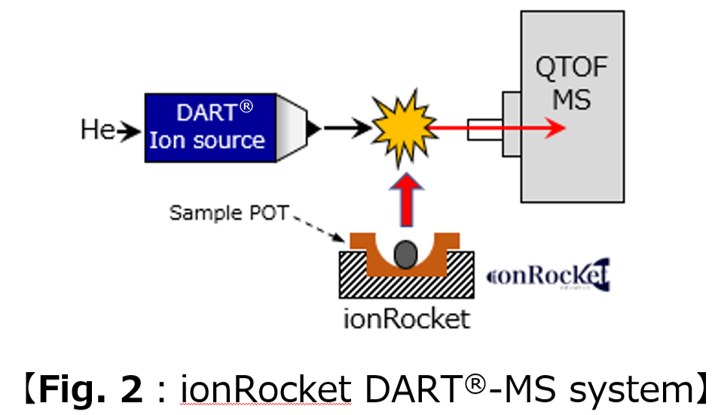 The ionRocket combined with a DART® equipped with Quadrupole Time of-Flight Mass Spectrometry (QTOFMS) was used as the analytical system for this application (Fig. 2). A small piece of sample (approximately. 0.5 mm²) was put into the ionRocket sample POT. A temperature gradient of 100°C/min. from room temperature to 600°C was applied (total run time: 7 min) directly to the samples.