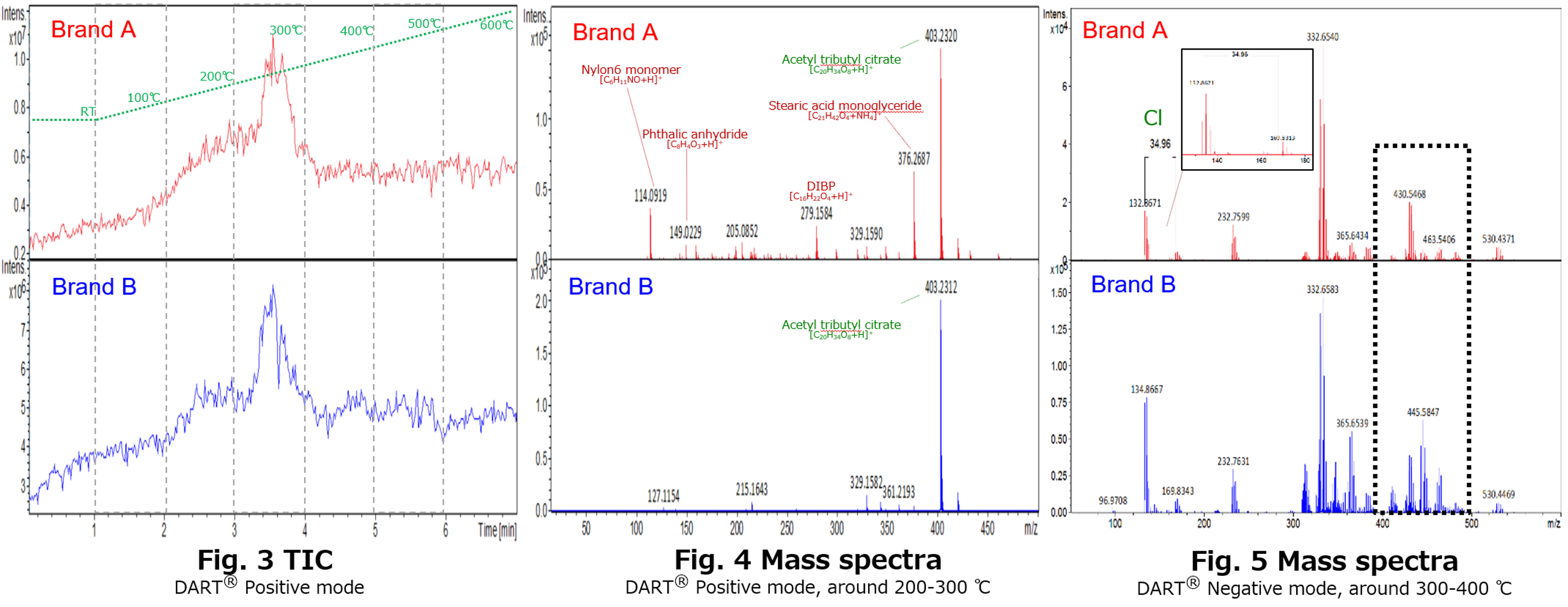 In the FT-IR spectrum shown in Fig. 1, the materials could not be identified as “PVDC” due to the influence of plasticizers. Also, FTIR showed no difference between the two samples. In the TIC shown in Fig. 3, no significant differences were observed between the samples. Fig. 4 shows the mass spectra acquired at 200-300°C. The samples can be distinguished by using additives as a marker, as different additives were detected in each sample. Additives were easily identified by using the industrial additive database “Compound Search” (BioChromato). Fig. 5 shows the mass spectra acquired at 300-400°C. Pyrolysis products of PVDC are detected in both samples, however, the detection intensities of pyrolysis products around m/z 450 are different, indicating that while both samples are PVDC, they do not share the same composition.