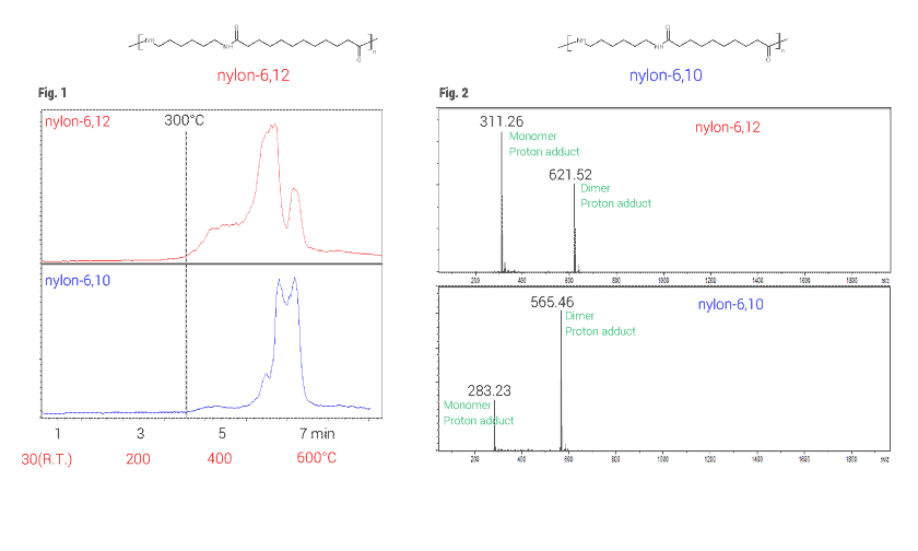 Nylon, the synthetic polymer and aliphatic polyamide, is one of the most widely used industrial polymers. Nylon is widely diffused due to its high rigidity and elasticity. Nylon-6,10 and nylon-6,12 reflect similar tendencies in FT-IR spectrum. In addition, the melting temperatures of both polymers measured by DSC are approximately 220ºC. This makes it difficult to discriminate between the two analogs.