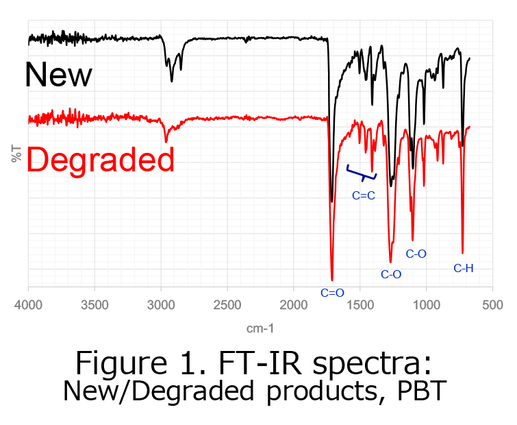 Polybutylene terephthalate (PBT), a thermoplastic engineering elastomer, is widely used in a variety of industrial fields. Due to its industrial applications, it is important to evaluate its degradation degree to facilitate the product development process. Although there are many methods to investigate degradation degree (ex. a Durometer, an Extensometer and FT-IR), it is difficult to detect the degradation degree during its initial degradation stage.