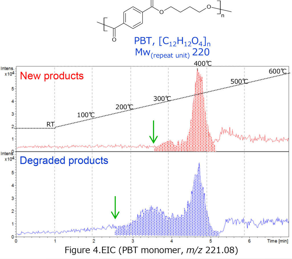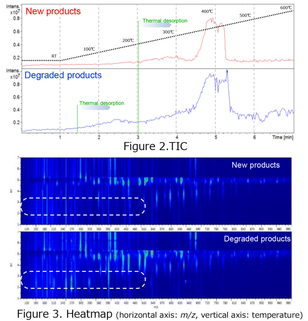 As a results of FT-IR, no significant difference was detected between the new and degraded products (Figure 1). Total ion current gram (TIC) of new and the degraded PBT products were shown in Figure 2. As adding the temperature gradient heating, thermal desorption and pyrolysis reactions were detected. The temperature at which thermal desorption products were detected were different between those two cases. For a detailed comparison, heat maps of the compounds were recorded, as shown in Figure 3. It was clear that the types and the intensity of detected ions differed considerably in the low temperature and low molecular weight region. Extracted ion current gram (EIC) of the PBT monomer (m/z 221.08, [C12H12O4+H]+) were shown in Figure 4. The PBT monomer were detected at a temperature much lower than the pyrolysis temperature of the PBT (ca. 400℃) between them. Moreover, for the degraded products, it was detected at much lower than the new products. It was presumed that PBT monomer was included as one of the degradation products.