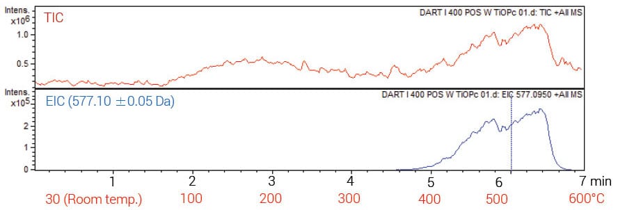 The ionRocket was directly connected to the DART®-MS. The sample was put on the POT and analyzed. The temperature was increased by 100ºC per minute from 30ºC to 600ºC.