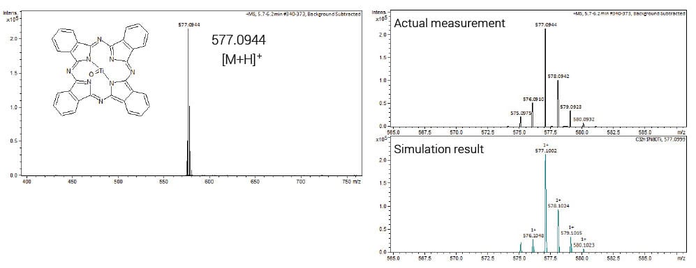 Titranyl phthalocyanine, Mmi 576.0927 Da, [M+H]+: 577.1003 Da.