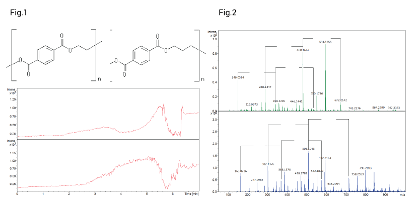 In order to analyze condensation polymers containing ester linkages such as polyester fiber, we usually use reaction pyrolysis GC/MS analysis which requires a methylating agent to suppress thermal decomposition products.