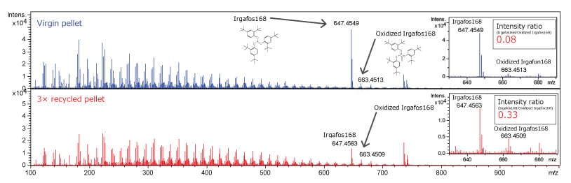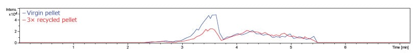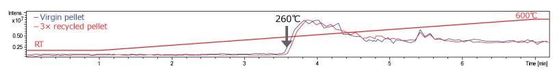 Regarding the TIC, no significant difference was detected between the samples, and similar thermal decomposition patterns were observed. However, regarding the MS spectra, Irgafos 168 and its oxidized compound were detected. In comparing the intensity ratios of the oxidized Irgafos 168 and pure Irgafos 168 between the samples, the ratio of the 3x recycled pellet was higher than that of the virgin pellet. This confirmed that the 3x recycled pellet increased oxidized Irgafos 168 by recycle. In addition, in comparing the extracted ion current grams for Irgafos 168 between the samples (Figure 3), the 3x recycled pellet showed less than the virgin pellet. This confirmed that Irgafos 168 was consumed by recycle. In summary, by using this method, additives contained in a polypropylene pellet and the polypropylene polymer matrix were detected independently and directly by gradient thermal heating. This method can be a useful way to evaluate the thermal history of recycled thermoplastic resins quickly and easily, by using the antioxidants contained in the thermoplastic resins as markers. Moreover, this method could be applied to quality control for thermoplastic resin products, such as containers and parts.