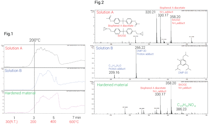 The hardening of two-part epoxy adhesive starts by mixing epoxy resin with a hardening accelerator. The analytical method of hardening materials is limited, because of the low amount of sample, and its difficulty to solubilize. The hardened material was analyzed with ionRocket heating system connected to the DART®-MS without pretreatment.