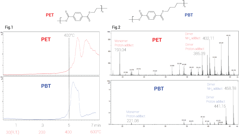 The comparisons of ionRocket-DART®-MS spectrum made it possible to distinguish between PET and PBT.