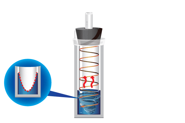 With the Vacuum Vortex Evaporation technology in the Smart Evaporator, the solvent is rapidly stirred in a airflow-based liquid vortex at steady atmospheric pressure, preventing bumping and sample loss. The secret to this bump-proof technology is the patented spiral plug® technology, which allows for air to continuously flow through the sample vial and rapidly evaporate without the risk of bumping. The key to no bumping is in the fundamental design that doesn’t allow bumping conditions to occur in the first place, as opposed to the burden of having to take precautions.