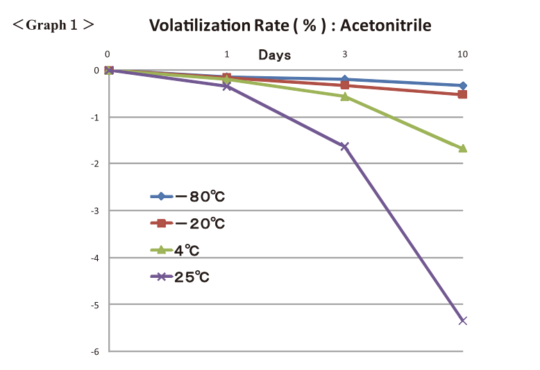 RAPID EPS showed high airtightness to acetonitrile under the temperature of -80°C, -20°C, 4°C, 25°C (Graph 1). At 25°C on day 10, volatilization rate was about 5.4%.