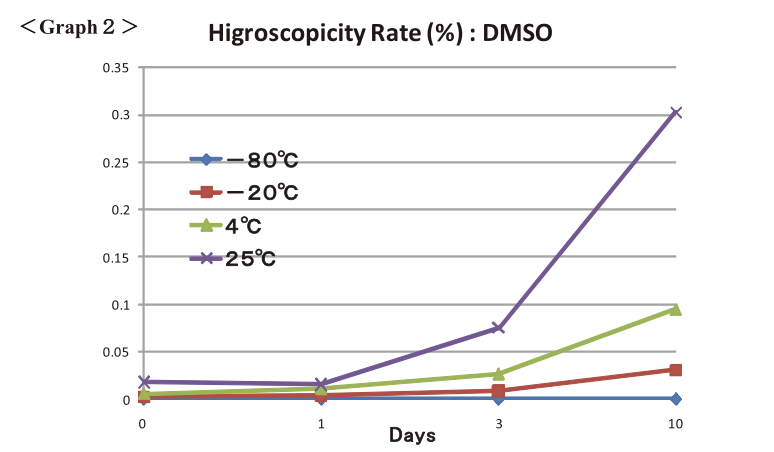 The airtightness of RAPID EPS was demonstrated to hygroscopic solvent, DMSO (Graph 2). The maximum increase in weight by hygroscopicity was observed 25°C on day 10, which was merely about 0.3% (Graph 2).