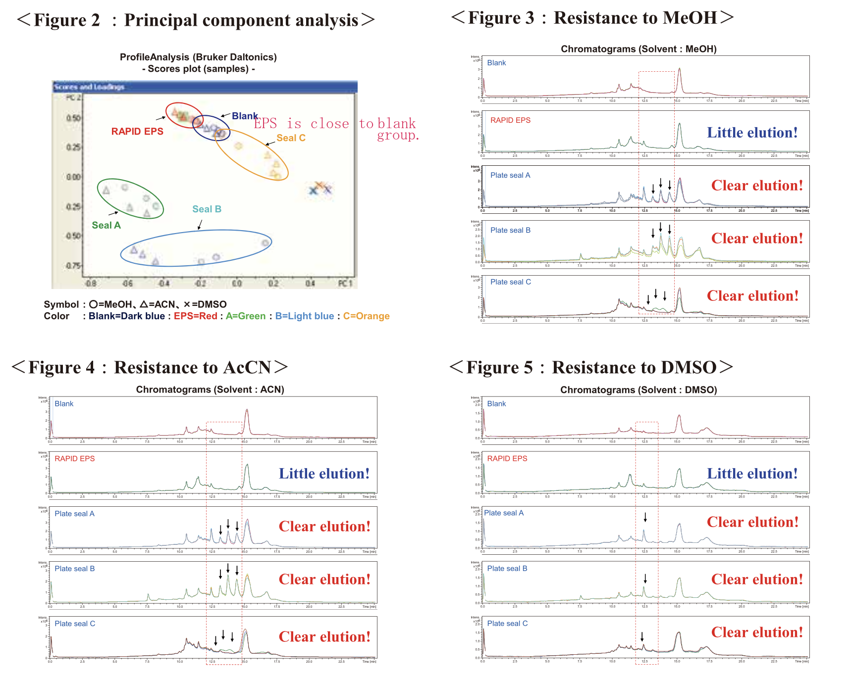 Researchers use plate seals to cover well plates. Therefore, one of criteria for moderate plate seals is resistance to solvents used for experiments and analysis. We compared the organic solvent resistance, such as methanol, acetonitrile and DMSO, between RAPID EPS and conventional plate seals, such as Seal A, B and C. The evaluation was based on LC/MS (micrOTOF, Bruker Daltonics) of each eluent after soaking each seal in the solvents. Results clearly showed higher organic solvent resistance of RAPID EPS over conventional seals. The difference was due to siloxane elution out of silicon based adhesive of conventional seals. On the other hand, RAPID EPS used synthetic rubber adhesive instead of silicon adhesive.