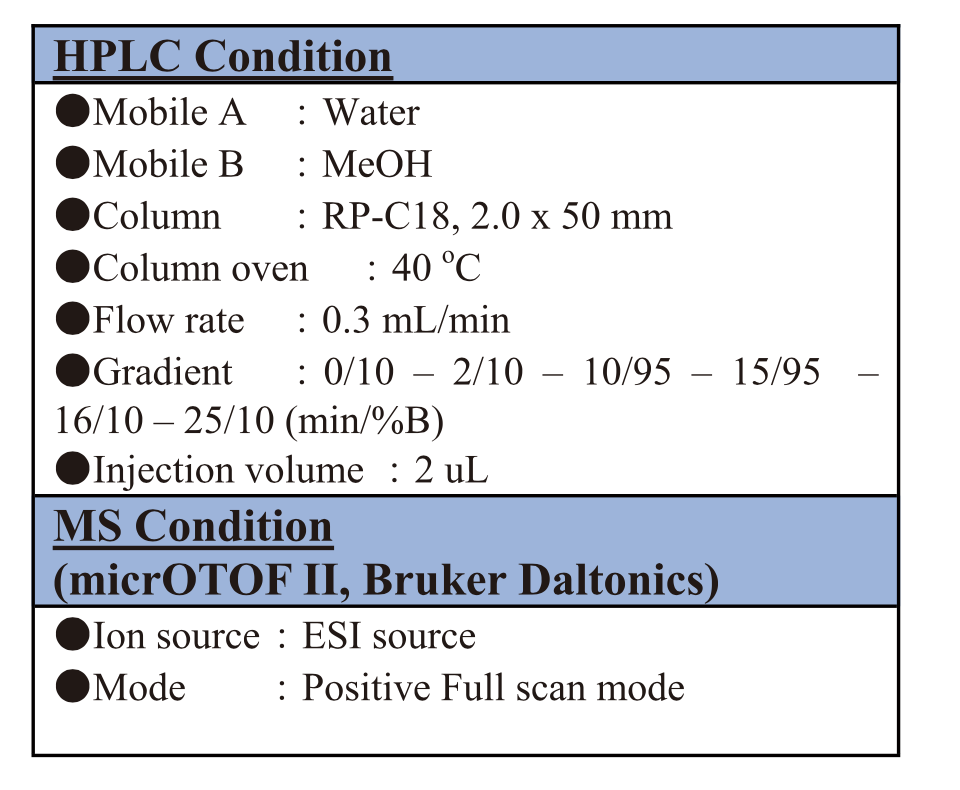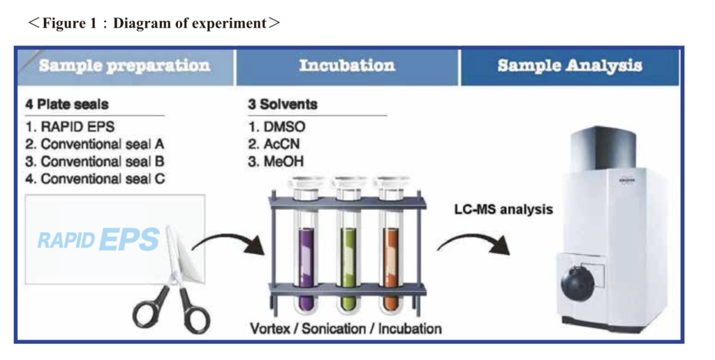 A piece of each plate seal was placed in a 1.5mL tube for soaking inorganic solvents such as MeOH, AcCN, DMSO. The tubes were incubated for 6 days after vortex and sonication. For LC/MS analysis, three samples from each tube were analyzed (see Figure 1).