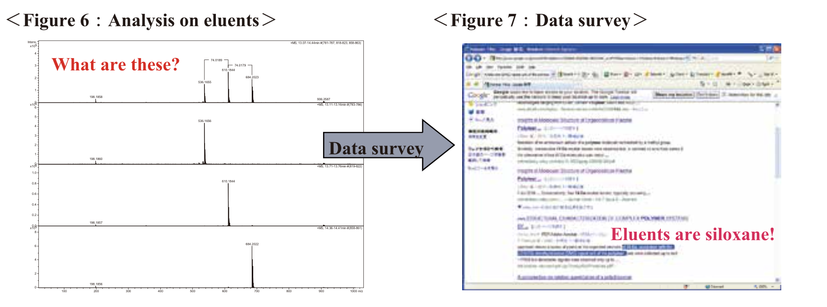Principal component analysis indicated RAPID EPS had less elution of adhesive material com pared with conventional seals (Figure 2). The group circled in red was closer to Blank group circled in blue than other groups (Figure 2). LC chromatogram (Figure 3, 4, and 5) showed more background peaks from conventional seals than RAPID EPS. The investigation of revealed the peaks were siloxane from silicon adhesive of conventional seals (Figure 6 and 7).