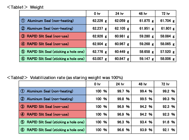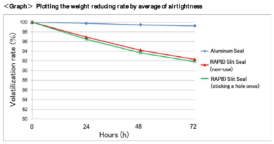 We evaluated the performance of airtightness of RAPID Slit Seal by measuring the weight of plates over time for 72 hours.250μL of 30/70 Acetonitrile/Water were dispensed to all wells of a 96 well plate. The plates were sealed with RAPID Slit Seal (non-use and sticking a hole one) and stored at temperature settings of 15°C.As a control for complete closed system, Aluminum Seals (non-heating) were used to cover well plates at the same condition. The verification was carried out by each 2 sheets for one kind of seal. Finally, we calculated the reducing rate of the plate weight.