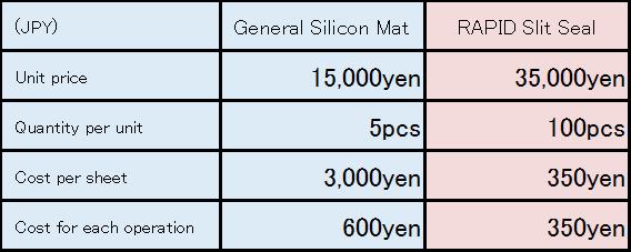 ■ Cost comparison between Silicon Mat (washed for 5 times to reuse) and RAPID Slit Seal